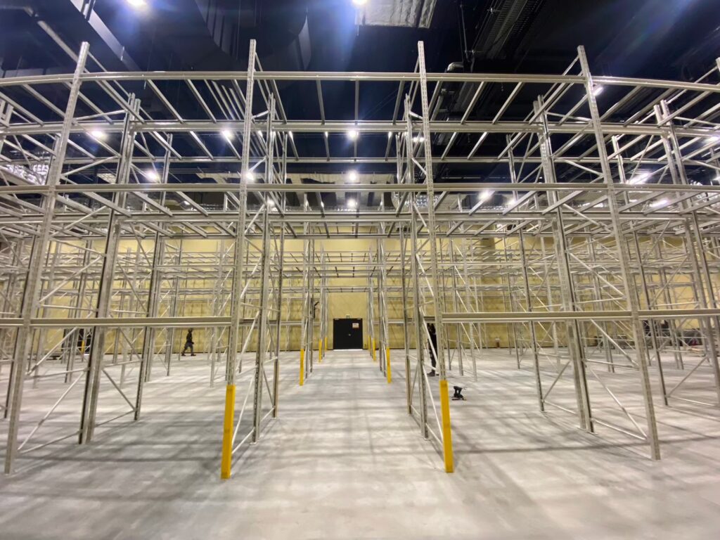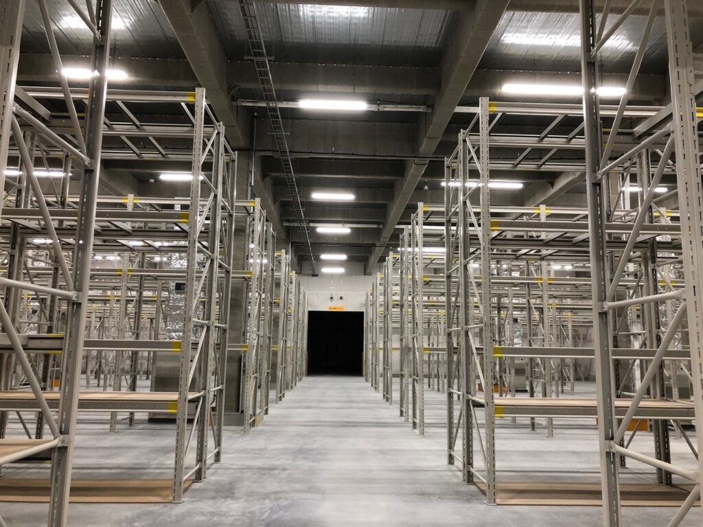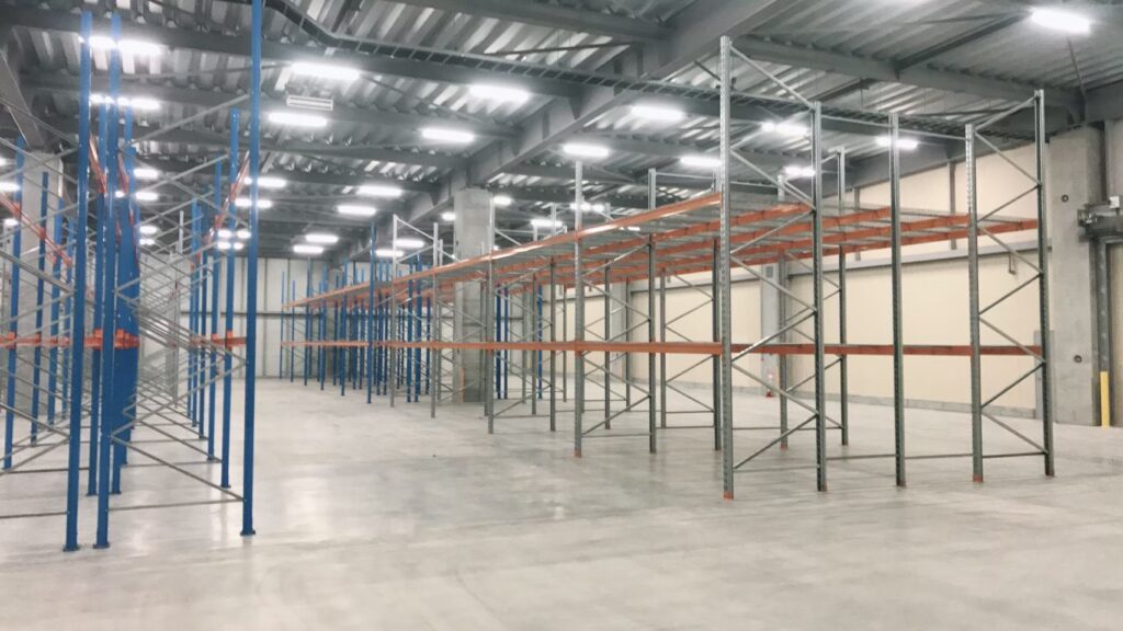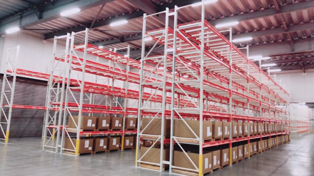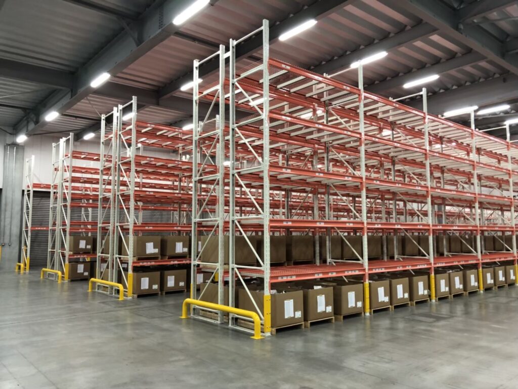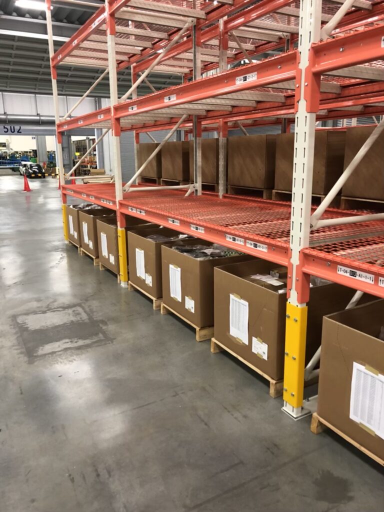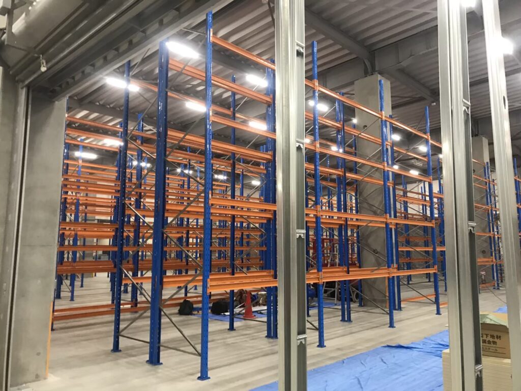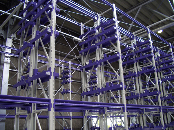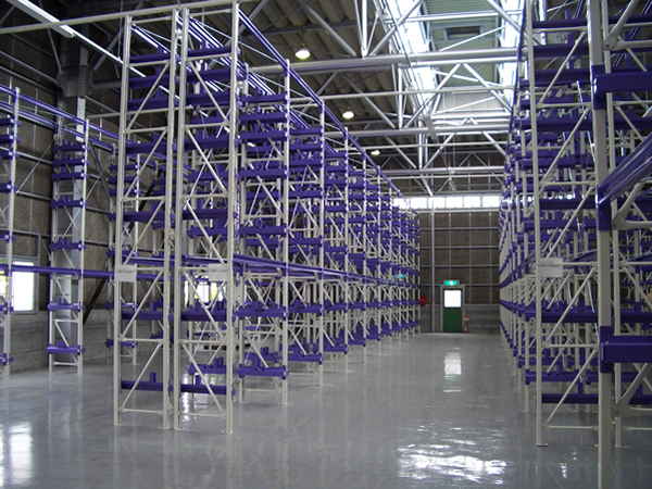 段重ねできないパレットの保管など、物流倉庫では最もよく使われているラックです。主にフォークリフトなどを用いて、フォーク通路を最小幅に抑えて棚数を増やし保管効率を上げたものです。