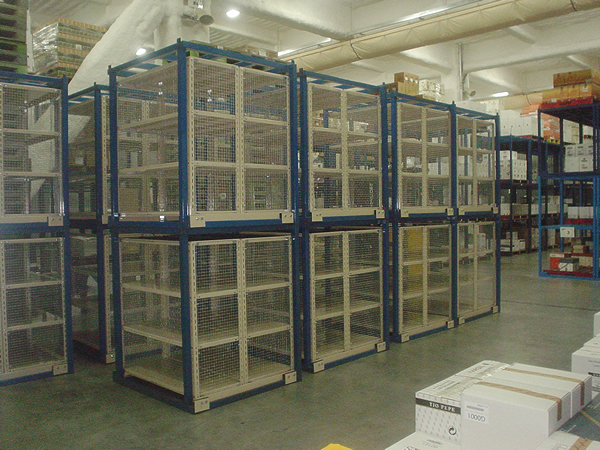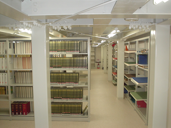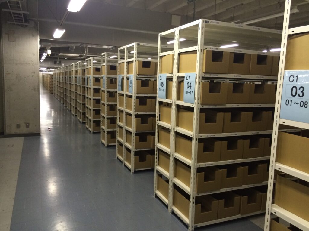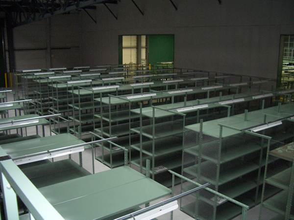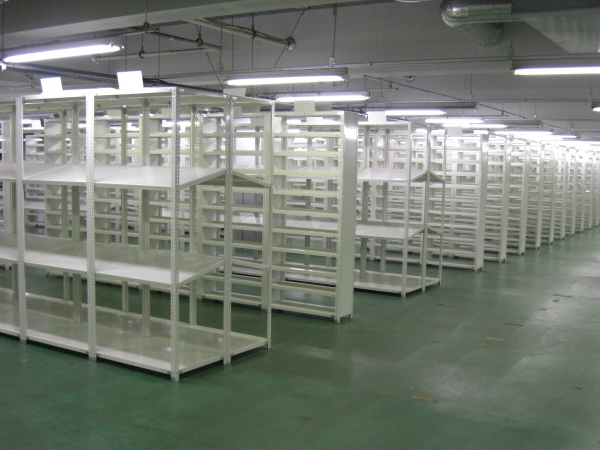 支柱はL字型アングルで、保管物の形状に応じて棚板を50mm単位で調節可能です。