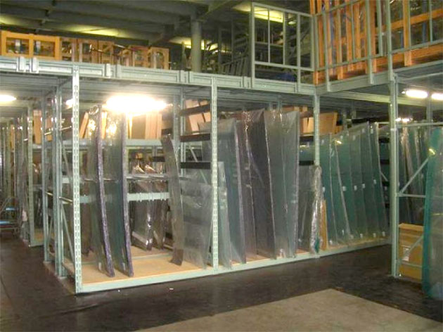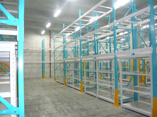 パレットラックを設置し、1段目の有効寸法を高くしてその中に中量ラックを入れる。これにより小スペースで用途の違う2種類のラックの設置ができました。