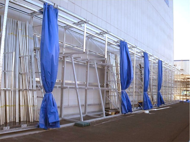 棚の錆対策として亜鉛メッキ塗装を行い、保管物の雨などによる濡れの対策には、天面には屋根を取付け、正面にはカーテンを取付けました。